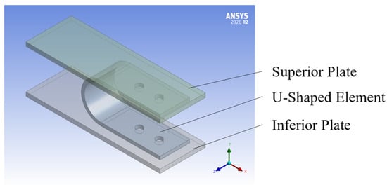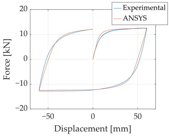The finite element model was developed in ANSYS, consisting of three distinct volumes: one representing the UFP element and two additional volumes corresponding to constraining plates that restrict the displacement of the device, as illustrated in Figure 24. To accurately replicate the behavior of A36 and A572 steel, isotropic elasticity was assigned. Additionally, the model incorporated kinematic hardening using the Chaboche law (Equation (16)) [37] and isotropic hardening based on the Voce law (Equation (17)) [38]. In those equations, α corresponds to the shift of the material’s yield surface, n corresponds to the number of curves used to characterize the material, and are model parameters, is the equivalent plastic strain, represents the updated yield stress due to hardening, denotes the initial yield stress, and are the linear and exponential hardening coefficients, respectively, and is a saturation parameter. In this model, it was assumed that stress saturates at a constant value, and therefore, the value of was taken as zero. The parameter was defined as the difference between the ultimate strength () and the yield stress () while the parameter was varied during the calibration process.