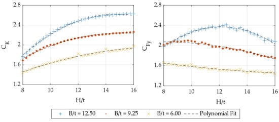 To develop numerical models for determining and , a set of FEMs was generated with varying geometric ratios. Since the objective is to construct lookup tables containing equations for estimating the correction factors, the selected variables were discretized as follows: L’/B at values {1; 2; 3}, B/t at values {6; 9.25; 12.5}, and H/t (being the most widely studied parameter) was discretized into 33 equally spaced values within the specified range. A total of 297 FEMs were generated, combining all possible values from the three parameter sets. The models assumed A572 steel as the material and were subjected to monotonic displacement loading at both 0° and 90°. The force–displacement curves obtained from each simulation were used to extract stiffness and yield force values, allowing the calculation of and for each set of geometric conditions. Figure 28 presents an example of the computed coefficients for L’/B = 1. The data revealed that these correction factors could be well-approximated using quadratic functions, enabling their estimation based on UFP geometric ratios. The general form of these equations is expressed in Equation (20), with the corresponding coefficients for each geometric condition provided in Table 4. It is important to note that these equations should only be applied within the specified validity ranges. If a required correction factor corresponds to an intermediate geometric ratio (L’/B or B/t) not listed in the table, a linear interpolation between the available values is recommended to obtain an initial estimate.