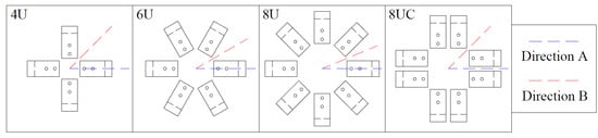 Lastly, Table 5 summarizes the normalized maximum force attained by the different configurations under loading in Directions A and B, as well as the percentage difference between them. The findings suggest that, when the system consists of three or more UFP elements, its behavior remains practically identical in any loading direction.