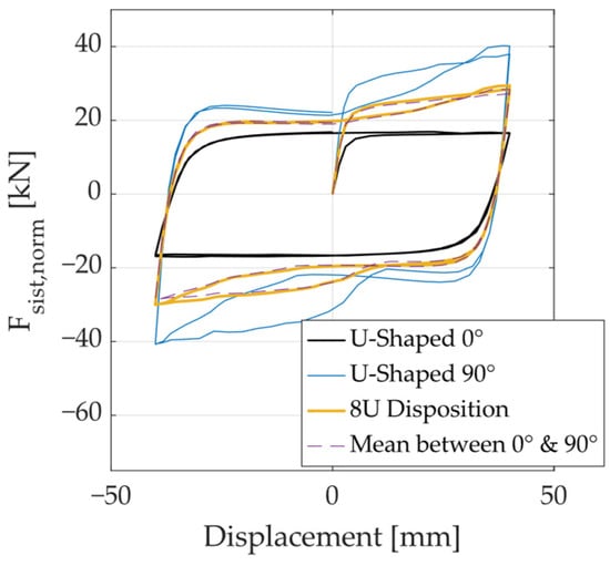 To facilitate comparison of the hysteresis curves, the system force was normalized by the number of UFP elements using the following expression: , where is the total force resisted by the device and is the number of UFP elements. Figure 31 presents the hysteresis curve for the 8U configuration, along with the hysteresis of a single UFP element loaded at 0° and 90°, as well as their average response. The results show that the average response of a single UFP at 0° and 90° closely matches the response of the 8U configuration. This suggests that the overall behavior of a multidirectional energy dissipation system based on UFPs can be fully characterized by analyzing the response of a single UFP loaded at 0° and 90°.