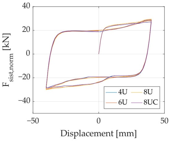 Additionally, Figure 32 presents the hysteresis of all configurations under loading in Direction A. The results indicate that, regardless of the number or arrangement of UFP elements, the force per unit element remains the same when the loading direction aligns with a single UFP element.
