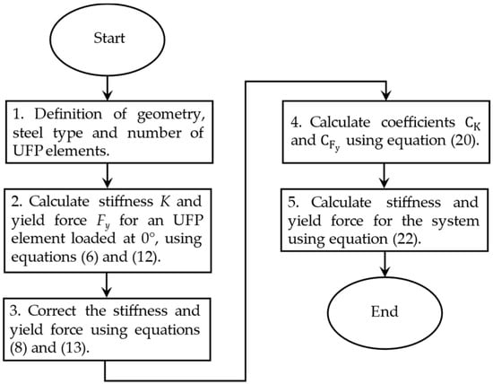 Based on the previous results and considering that the force–displacement response of the multidirectional device is solely dependent on the behavior of a single UFP loaded at 0° and 90°, a method for estimating system stiffness (Ksist) and yield force (Fy,sist) is proposed using Equation (21), where Nu is the number of UFP elements in the system. As established in the previous section, both stiffness and yield force of a UFP loaded at 90° can be determined from its properties at 0°. Therefore, the mechanical properties of the entire system can be expressed exclusively in terms of the properties of a single UFP loaded at 0°, as presented in Equation (22). To facilitate the estimation of stiffness and yield force for the multidirectional dissipation system, a flowchart outlining the step-by-step procedure is provided in Figure 33.