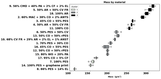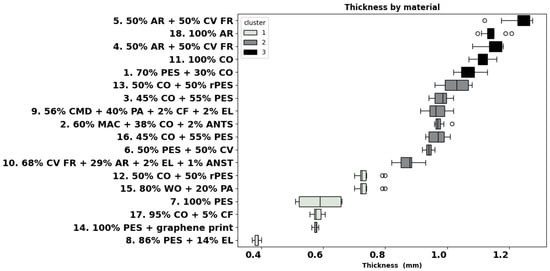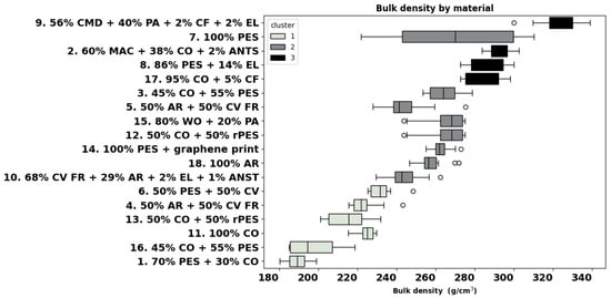 The bulk density of the knitted fabrics ranges from 189 g/cm3 (fabric 1) to 322 g/cm3 (fabric 9). Cluster analysis highlights three main groups with similar characteristics, as shown in Figure 3. Cluster 1 considers fabrics with a density lower than 233 g/cm3 with fabrics like 6, 4, 13, 11, 16, and 1. Cluster 2 ranges values from 234 to 270 g/cm3, including fabrics like 10, 18, 14, 12, 15, 5, and 3. In this cluster, a large data distribution can be noticed for polyester fabric 7, in line with its large thickness variation (Figure 2). Finally, cluster 3 includes garments with a density higher than 284 g/cm3, like fabrics 17, 8, 2, 7, and 9.