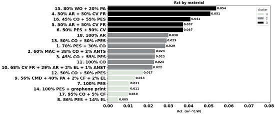 The thermal resistance of all the fabrics is displayed in Figure 6, which shows that among all fabrics, the polyester blend fabric 8 has the lowest thermal resistance Rct value of 0.0052 m2·°C/W. In contrast, aramid blend fabric 4 has a ten times higher thermal resistance (0.051 m2·°C/W), and the wool blend 15 slightly exceeded it, which makes it suitable as thermal underwear for cold protection. The polyester blend fabrics 7, 8, and 14 exhibit the lowest Rct values, recommending them for sport or intense activity work. Three clusters were identified, where cluster 1 consists of fabrics 12, 9, 7, 14, 17, and 8 with a thermal resistance lower than 0.018 m2·°C/W. Cluster 2 covers moderate thermal resistance ( 0.022 and 0.030 m2·°C/W) fabrics 10, 11, 3, 2, 1, 13m and 18 and cluster 3 contains fabrics 6, 5, 16, 4, and 15 with a thermal resistance higher than 0.037 m2·°C/W.