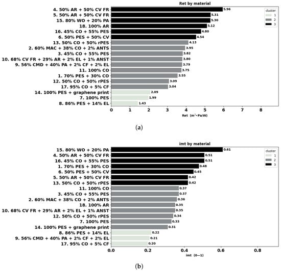 The water vapour resistance largely varied between 1.43 m2·Pa/W for polyester fabric 7 and 5.96 m2·Pa/W in the case of aramid-viscose FR fabric 4, as can be seen in Figure 7a. Cluster analysis highlights three main groups. Cluster 1 includes garments with a resistance lower than 2.1 m2·Pa/W with polyester fabrics for sportswear garments (14, 7, and 8), suitable for high-intensity sports activities. Cluster 2 includes garments 17, 12, 1, 11, 9, 10, 3, 2, and 13 with a thermal resistance between 3.04 m2·Pa/W and 4.13 m2·Pa/W. Finally, cluster 3 includes fabrics 6, 16, 18, and 15 and aramid blends 5 and 4 with values higher than 4.5 m2·Pa/W.