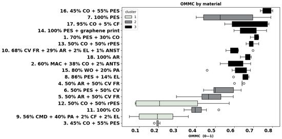 As shown in Figure 8, most of the fabrics exhibited a high OMMC in the range of 0.5–0.7, with fabric 16 (45% CO + 55% PES) even reaching an OMMC value of 0.8. Cluster analysis highlights three groups, where cluster 1 reflects the poorest OMMC grade with a maximum value of 0.19 and includes fast-absorbing, quick-drying fabric 3 and slow-absorbing, slow-drying fabrics 9 and 12. Cluster 2 contains fabrics 11, 5, 6, and 7 with OMMC values between 0.46 and 0.53; cluster 3 shows higher values than 0.61, including water penetration fabrics 2, 13, 16, and 17 and water management fabrics 16, 17, 14, 1, 13, 10, 18, 2, 15, and 8. Water penetration fabric 4 also belongs to this cluster, probably due to its large variation and many outliers.