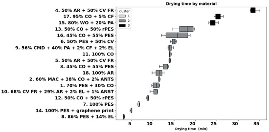 The drying time of the eighteen fabrics, laid on a metal plate at 37 °C, exposed to an airflow of 1.5 m/s applied parallel with the fabric surface, was measured after the surface was wetted with 0.2 mL of water. Most of the fabrics dried within 5–15 min; thin fabric 8 (86% PES + 14% EL) dried quickest in about 3 min, and underwear fabrics 15 (80% WO + 20% PA) and 17 (95% CO + 5% CF) dried in roughly 25 min. Fabric 4 (50% AR + 50% CV FR) dried slowest (33 min). Cluster analysis highlighted three groups, as shown in Figure 9. Cluster 1 includes fabrics 12, 7, 14, and 8, which dried in less than 9 min, and cluster 2 includes fabrics with a drying time between 10 and 18 min, namely fabrics 10, 1, 2, 18, 3, 5, 11, 9, 6, 16, and 13. Finally, aramid fabric 4, cotton blend fabric 17, and wool fabric 15, which had the longest drying times (more than 24 min), were grouped in cluster 3.