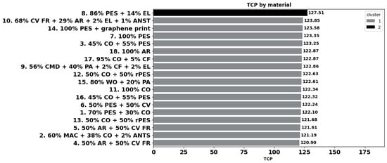 The thermo-physiological comfort performance (TCP) of the fabrics was assessed using the model of [69], developed for single-layered and multi-layer woven fabrics used for workwear, and includes key fabric parameters such as mass, moisture spreading speed, and evaporative resistance. As illustrated in Figure 10, the TCP of the eighteen fabrics varied between 120 and 127, and the cluster analysis highlighted two groups where the main difference was with fabric 8, showing the highest TCP score among all fabrics.