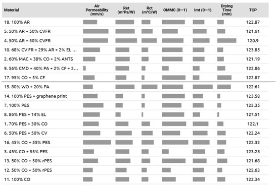 The thermo-physiological comfort performance (TCP) of the fabrics was determined using the model of [69], developed for fabrics used in workwear using the equation: TPC = 126.32 − 0.02 × W + 0.64 × SST − 0.05 × Ret, where Ret is evaporative resistance, W is fabric mass, and SST is water spreading speed on the top of the fabric, determined by MMT equipment.
