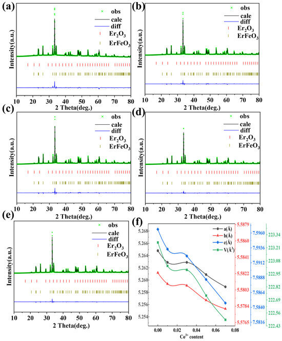 The raw materials, including ferric oxide (Fe2O3), erbium oxide (Er2O3), and cobalt (III) oxide (Co3O4), were purchased from Macklin Chemistry Co., Ltd. (Shanghai, China), with all materials having a purity of over 99%. Anhydrous ethanol, used as a grinding and dispersing agent, was purchased from Aldrich Chemistry Co., Ltd. (Shanghai, China).