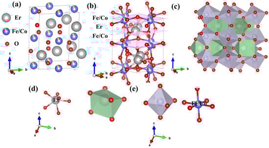Figure 4a–e presents the structural diagram of EFCO, revealing that it adopted a classic distorted perovskite structure. The unit cell of EFCO contained four molecules. In this structure, Fe ions formed an octahedral configuration with six O ions, which further connected to create a three-dimensional network (Figure 4b,c). Er ions were located in the interstitial sites. Due to distortion effects, the Fe–O–Fe bond angles deviated from the ideal 180°. This distortion caused the FeO6 octahedra to tilt away from the c-axis, resulting in changes to the Fe–O–Fe bond angles. In Figure 4e, the O ions bonded to Fe occupy two distinct crystallographic sites, denoted as O1 and O2. O1 occupied two vertices of the octahedron along the [001] direction, while O2 occupied the remaining four vertices perpendicular to the [001] direction. This was consistent with the results obtained from Rietveld refinement. Additionally, in EFCO, Er ions were coordinated with six oxygen ions to form a polyhedron, as shown in Figure 4d.