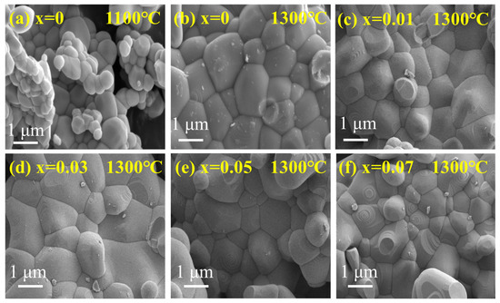 To investigate the microscopic structure of EFCO, Figure 5a–f presents SEM images of EFCO at various calcination temperatures and doping ratios. When the calcination temperature was below 1300 °C, the grains were underdeveloped, and significant voids were present. This resulted in a non-dense structure. As the calcination temperature increased, the grain size grew significantly and adopted a polygonal structure. This indicated more complete grain growth and reduced inter-particle voids, leading to a denser structure.