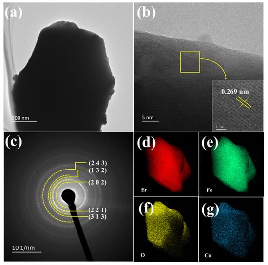 (a) TEM image of EFCO (x = 0.05). (b) HRTEM image of EFCO (x = 0.05). (c) SAED image of EFCO (x = 0.05). (d–g) EDS images of Er, Fe, O, and Co elements.