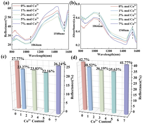 (a) Comparison of reflectance at different Co3+ doping concentrations. (b) Absorption spectra at different Co3+ doping concentrations. (c) Detailed reflectance of EFCO at 1064 nm under different x values. (d) Detailed reflectance of EFCO at 1540 nm under different x values.