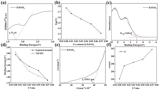 Figure 8e,f illustrate the threshold wavelength of EFO and the variation in threshold wavelength for EFCO with different Co ion doping levels. Detailed data can be found in Figure S7. The inverse of the threshold wavelength was determined by extrapolating the linear portion and intersecting it with the X-axis. As the Co ion doping levels increased, the threshold wavelength also increased. This indicated a decrease in the energy required for electronic transitions. This trend aligned with the bandgap change estimated using the Kubelka–Munk formula. Consequently, Co ion doping enhanced the electronic transitions within EFCO in a favorable direction.
