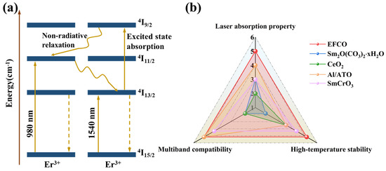 The results indicated that EFCO exhibited high-temperature stability, dual-band compatibility, and laser absorption capabilities. Previous studies have identified various laser suppression materials, including Sm2O(CO3)2⋅xH2O [26], CeO2 [68], Al/ATO [25], and SmCrO3 [69], as illustrated in Figure 9b. However, none of these materials combined all three properties: dual-band compatibility, laser absorption, and high-temperature stability. This unique combination in EFCO underscores its potential for dual-band laser suppression applications.