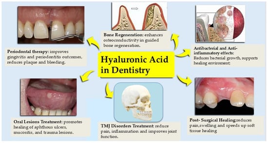 HA is biocompatible, immunologically inert and acts as a lubricant by interacting with proteoglycans and other bioactive molecules [3]. The biological activity of hyaluronic acid is largely mediated by its molecular interactions with specific cell surface receptors, primarily CD44, RHAMM (Receptor for HA-Mediated Motility), and TLR2/4. Binding of HA to CD44 initiates signaling cascades that regulate cell adhesion, proliferation, and migration, crucial for wound healing and tissue regeneration. RHAMM, on the other hand, is involved in cell motility and cytoskeletal organization. Additionally, low molecular weight HA fragments can activate Toll-like receptors (TLR2/4), modulating inflammatory responses. These interactions influence ECM dynamics, angiogenesis, and the modulation of oxidative stress, positioning HA as a key player in regenerative and anti-inflammatory processes. HA tissues have been shown in scientific studies to have bacteriostatic, anti-edematous, pro-angiogenic, fungistatic and anti-inflammatory properties [4,5,6,7,8]. In addition to its widely recognised mechanical and hydration properties, recent studies have revealed the role of HA in biochemical and cellular processes under both physiological and pathological conditions, influencing its metabolism [9,10,11,12,13,14,15]. Several HA-interacting membrane receptors such as CD44, RHAMM, HARE and toll-like receptor 4/2 have been found to activate various signalling pathways modulating developmental activity, morphogenesis, tumour activity, cell migration, apoptosis, cell stimulation and inflammation [16,17,18,19,20,21,22,23,24,25]. The biological properties of HA are closely related to its molecular weight. It appears that the use of low and high molecular weight HA has diametrically opposite effects. A high molecular weight HA polymer > 1000 kDa can generate clustering at the cell membrane receptor with anti-apoptotic activity, whereas low molecular weight HA fragments can induce pro-inflammatory effects with increased presence of inflammatory cells and macrophages [26,27,28,29,30,31]. Recognising the multiple biological versatility of HA, its use has also been applied to the soft tissues of the oral cavity [32,33,34,35,36,37,38,39]. Indeed, in recent years it has gained increasing interest as an alternative or complementary therapy to biomaterials, demonstrating benefits in post-surgical (frenectomy, extraction therapy, regenerative surgery) and periodontal therapy, with reduced pain, burning and soft tissue healing times [40,41,42,43,44,45]. The concentration of high molecular weight HA products used ranged from 0.2% to 0.8%. The difference in clinical outcomes may have been influenced by the use of different concentrations, frequency and treatment plan protocol [46,47,48,49,50,51,52]. It has also been shown to be effective in the treatment of aphthous lesions, gingivitis and periodontitis, with significant reductions in bacterial plaque, gingival bleeding and crevicular fluid indices [53]. Compared with the use of other biomaterials used in periodontal regeneration, such as enamel matrix derivatives (EMD) or polynucleotides (PN) or sodium hypochlorite/amino acids, some results suggest that cross-linked hyaluronic acid (xHyA) is proving to be a viable alternative for periodontal regeneration, as well as potentially being cheaper and easier to use, although other studies show its potential as an adjuvant and not necessarily as an alternative to conventional treatments [54,55,56,57]. The stabilisation of blood clots at the site of application would justify HA’s ability to reduce healing time by activating neoangiogenesis, fibroblast migration and reducing the inflammatory response [58,59,60,61,62,63,64,65,66,67]. The use of HA as a scaffold in guided bone regeneration techniques, mixed with autologous bone, alloplastic and xenoplastic materials, has shown increased osteoconductivity [68]. Other research, although promising in clinical trials, has not produced significant results in bone regeneration [69,70,71,72,73,74,75,76,77]. Due to its lubricating and anti-inflammatory properties, HA has been extensively used and studied in the treatment of osteoarthritis (OA) and temporomandibular joint (TMJ) disorders, reducing pain, inflammation and restoring joint function with no adverse events [78,79]. However, intra-articular injections of HA combined with arthrocentesis have been shown to be less effective in relieving pain and opening the mouth than the injection of fibrin-rich plasma, also combined with arthrocentesis [80,81,82]. In contrast, there has been no evidence of benefit from HA injection in TMJ arthroscopy [83,84,85,86,87]. The aim of our research was to evaluate the versatility of HA in dental practice (Table 1) (Figure 3) [88,89,90,91,92,93]. Recent clinical trials have demonstrated significant benefits in a variety of clinical dental problems [94,95,96,97,98,99]. Continuing to explore the various applications of HA and optimising treatment protocols will be critical to maximising clinical benefits and developing innovative therapies to realise the full potential of this biopolymer in dental practice.