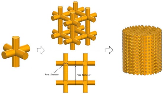 We utilized NX2312.1700 software (Siemens Digital Industries Software, 2023, Munich, Germany) to construct the scaffold model. The detailed modeling process for the porous titanium alloy scaffold is illustrated in Figure 1. Initially, we designed the structural unit of the cubic unit cell for the porous titanium alloy scaffold. Subsequently, multiple unit cells were connected following a cubic arrangement, and a Boolean intersection operation was performed between these units and a cylinder. This process resulted in a porous titanium alloy scaffold test sample with a diameter of 10 mm and a height of 10 mm, comprising several small cubic structural units. The pore diameter and porosity of the scaffold were controlled by adjusting the diameter and height of the struts. The specific dimensions used in the design are summarized in Table 2.
