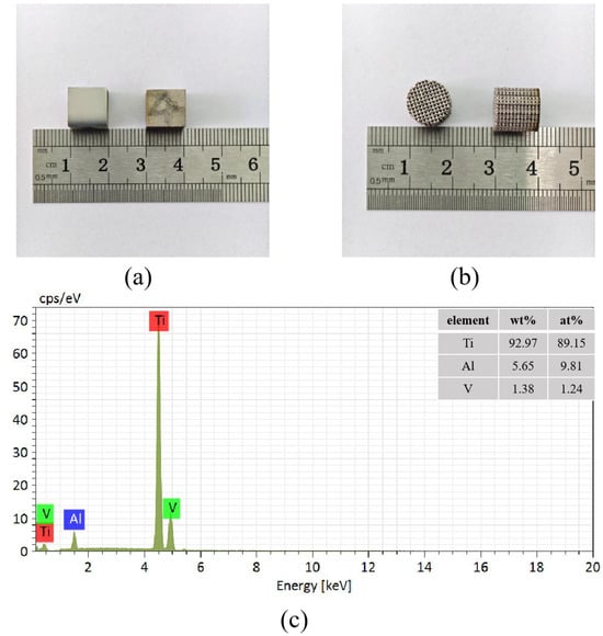 (a) Cubic block sample; (b) Cylindrical porous Ti6Al4V scaffold sample; (c) The chemical composition of the fabricated samples detected by EDS.