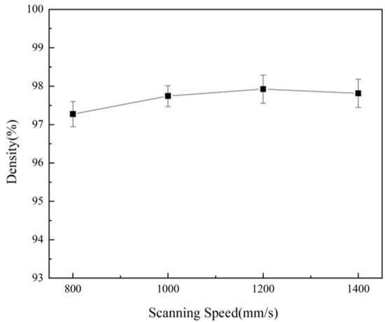 Figure 3 illustrates the density curves of bulk samples printed at various scanning speeds. As the scanning speed increased, the sample density initially rose before declining. At a scanning speed of 800 mm/s, the samples exhibited their lowest density, measuring 97.27%. With an increase in scanning speed, the sample density improved, reaching its peak value of 97.93% at 1200 mm/s. However, as the scanning speed continued to increase, the sample density decreased; at 1400 mm/s, the density fell to 97.81%.