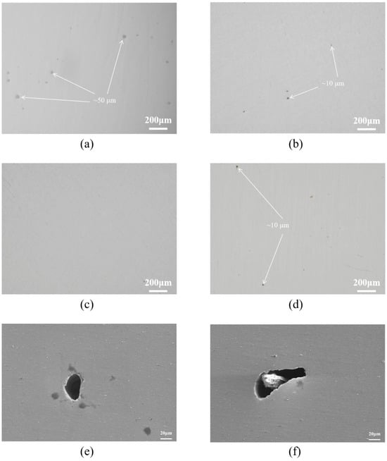 (a–d) OM images of the XOY plane of bulk samples formed at different scanning speeds. (a) v = 800 mm/s; (b) v = 1000 mm/s; (c) v = 1200 mm/s; (d) v = 1400 mm/s; (e,f) Defect morphologies on the XOY plane of bulk samples at different scanning speeds. (e) v = 800 mm/s; (f) v = 1400 mm/s.