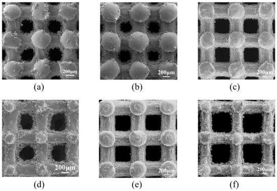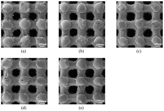 The porous scaffolds were examined using a scanning electron microscope (SEM). Figure 5 illustrates the strut morphologies of porous scaffolds with varying porosities. The struts of the porous Ti6Al4V scaffolds fabricated via selective laser melting (SLM) exhibited continuity and were free from macroscopic flaws such as fractures or misalignments, with pore geometries remaining well-defined. Notably, a significant number of un-melted powder particles were observed adhering both within the scaffold structures and in the vicinity of the struts [31].