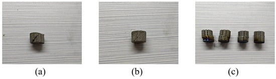 Figure 2a,b illustrate two types of samples manufactured using selective laser melting (SLM) with Ti6Al4V powder. The first type is a cubic block, with all dimensions—length, width, and height—measuring 10 mm. This sample was utilized for density testing and surface defect observation. The second type is a cylindrical porous titanium alloy sample, featuring a diameter of 10 mm and a height of 10 mm, designed for compression property testing and chemical polishing experiments.
