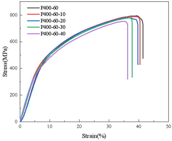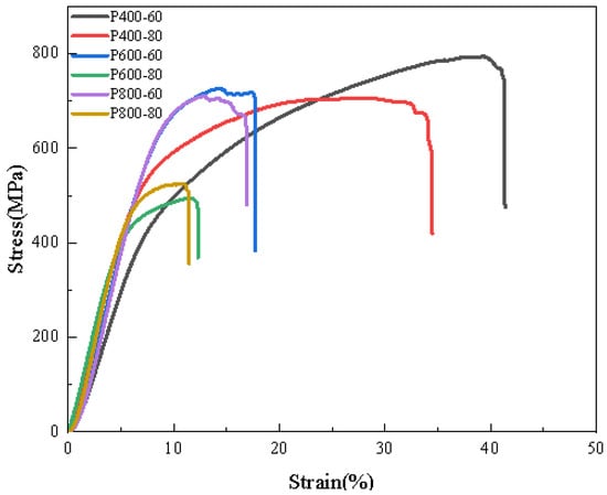 The compressive stress–strain curves of porous Ti6Al4V are presented in Figure 7, with Table 4 detailing the specific compressive properties of the porous titanium alloy scaffolds. Once implanted into the human body, porous scaffolds are subjected to complex stresses [32]. For bone scaffolds that must bear loads, it is crucial they exhibit high strength and good stability. Premature fractures indicate scaffold failure; thus, these structures must also demonstrate excellent plastic deformation capabilities to avoid breaking under pressure [33]. From the stress–strain diagrams of the porous Ti6Al4V, it is evident that sample P400-60 achieved a maximum compressive strength of 794 MPa and a maximum fracture strain of 41.35%. In contrast, the stress–strain curves for P600-60, P600-80, P800-60, and P800-80 indicated that these samples experienced relatively minimal plastic deformation before fracturing. Consequently, P400-60 demonstrated superior suitability as an orthopedic implant due to its enhanced mechanical properties and greater capacity for plastic deformation.