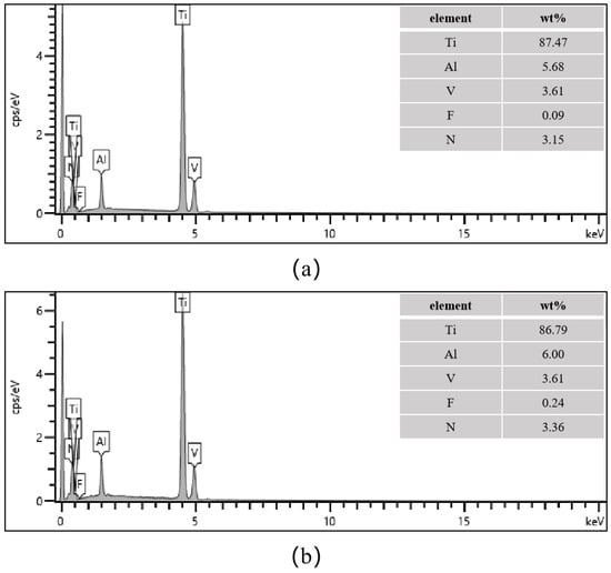 EDS analysis of the samples before and after polishing reveals that the content of the fluorine (F) element increases from 0.09% to 0.24%, as shown in Figure 10. Therefore, XPS is needed to determine whether the fluorine element exists as free fluoride ions or in the form of Ti-F bonds. We fully recognize the importance of XPS analysis in determining the chemical state of the fluorine element and its biological implications. In the subsequent stage of this study, we will conduct high-resolution XPS analysis to distinguish the chemical states of the fluorine element and correlate them with the in vitro cytotoxicity results.