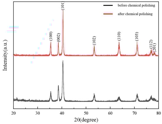 XRD analysis revealed consistent diffraction peak positions between pre- and post-polishing patterns, as shown in Figure 11, confirming no alteration in the crystallographic structure of the porous titanium alloy. Variations in peak intensities were attributed to changes in surface grain orientation, residual stress, or topography induced by polishing. Chemical polishing did not introduce extraneous phases, as indicated by the absence of impurity peaks and unaltered peak width/sharpness, while preserving the dominant titanium alloy phase and crystallographic integrity.
