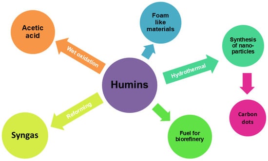 Humin formation is inevitable due to the thermodynamic characteristics of the acid-catalyzed reaction, and its extent depends on the initial feedstock concentration; specifically, a higher initial feedstock concentration leads to higher humin yields. The humin yield is usually 20–50%, with a carbon content of 55–65% [12]. The latter means that much of the carbon of the feedstock would be lost if not used to obtain any interesting product. As they are a particularly abundant by-product, exploring new ways to utilize humins to prepare new high-added-value products is essential. Currently, humins are mainly used as fuel for heat generation owing to their carbon rich characteristics, but they have the potentiality to be converted into oils and syngas [13] through thermochemical processes, into acetic acid [14] by means of wet oxidation, or into valuable composites/materials [15]. Recent applications of humins in developing new materials have included a synthesis of a macroporous foam-like substance [16], along with a few approaches to nanomaterials [17,18] (Figure 2).