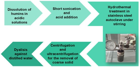 This synthetic approach involved treating the humin samples in a muffle furnace at 250 °C for 2 h (in an air atmosphere). Subsequently, an aliquot of each obtained sample residue was dispersed in distilled water and sonicated at 550 W in an ultrasonic bath for 30 min at room temperature. The black mixture obtained after sonication was centrifuged at 4000 rpm to remove coarse residues and the supernatant was filtered. The resulting solution was ultracentrifuged for 30 min at 20,000 rpm, and finally the supernatant was analyzed by UV-vis spectroscopy (Figure 8).
