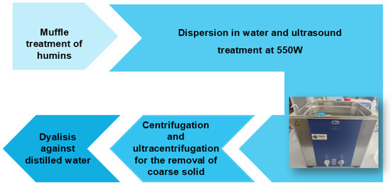 Humins (obtained from dehydration of soybean peels and phosphoric acid, H2) were muffle-treated at 250 °C for 2 h (in air atmosphere). A sample of 50 mg of the residue obtained was dispersed in 5.5 mL of distilled water and was subjected to sonication at 550 W (ultrasonic bath) for 30 min; the black mixture obtained after sonication was centrifuged at 4000 rpm to remove coarse residues and the supernatant was subjected to filtration (with 0.2 μm filter). The resulting solution was ultracentrifuged for 30 min at 20,000 rpm. This test was named T5.