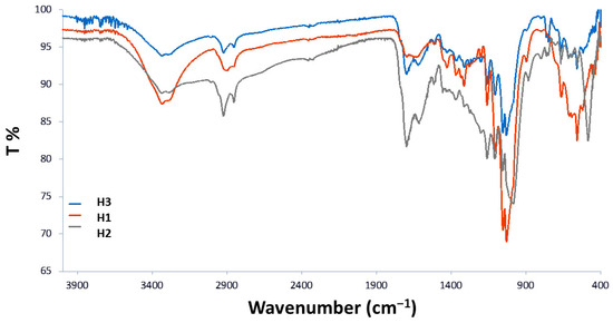 ATR-FTIR overlapped spectra of humins H1–H3 obtained from soybean peels with H3PO4 and pretreatment, acetic acid and H3PO4.
