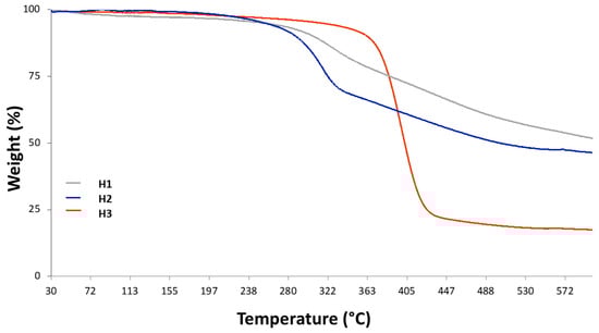 TGA analysis of humins has been carried out from 30 °C to 600 °C using a temperature ramp of 10 °C/min. The profiles obtained from the TGA analyses of the various humic samples (Figure 6) show that they all exhibit an inflection between 300 °C and 400 °C. This is a classical behavior of organic carbonaceous materials. However, it is possible to appreciate a relevant difference between the humins deriving from the simple acidic and thermal treatment (H1 and H2) and the one pretreated with phosphoric acid at 80 °C for 2 h (H3). While the stability of the first two is quite low at already 250–300 °C, as if they start losing functional groups on their edges, the third sample, having been subjected to a harsher process, results in being more stable at this temperature and its weight loss profile shows a defined variation at 400 °C, with a rather stable residual between 450 °C and 600 °C (21 and 17.7%, respectively). The behavior of the other two samples at the same temperatures is quite different (66.3 and 51.8 for H1 and 55.8 and 46.4% for H2), demonstrating that the samples are less thermosensitive but, at the same time, that they did not reach stability at 600 °C. Thus, it is noticeable that the longer exposure of soybeans peels to H3PO4 reduced the thermal stability of humins (H3) at high temperatures, as confirmed by TGA results. In particular, the drastic weight loss indicated the presence of more oxygen-containing functionalities in the humin material after additional acidic treatment in comparison with H1 and H2, even though the more instable carboxylic groups on the surface are more abundant on H1 and H2 as demonstrated by the weight loss of those preparations at low temperatures (250–350 °C).