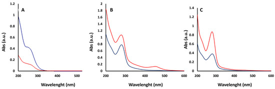 UV-vis absorption spectra of (A) T1A (blue) and T1B (red); (B) T2A (blue) and T2B (red); (C) T3A (blue) and T3B (red). All samples are measured after ultracentrifugation.