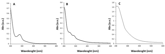 The hydrothermal synthesis of CDs was carried out at 200 °C, since preliminary experiments indicated that at lower temperatures no fluorescence was observed in the solutions, suggesting that the formation of CDs did not occur in these conditions, while at higher temperatures no significant increase in fluorescence was observed. This result is similar to that reported by Zhang et al. [17], who even found a decrease in fluorescence at temperatures above 200 °C. The effect of reaction time was evaluated by carrying out the synthesis at 3 h and 6 h as representative of a “short” and a “long” reaction time. Therefore, humins obtained from different processes (acetic acid T1; H3PO4-T2, and H3PO4 with pretreatment T3) have been briefly sonicated and treated in a stainless-steel autoclave for 3 h (A tests) and 6 h (B tests) in an acidic environment using phosphoric acid. Phosphoric acid was selected for hydrothermal synthesis because of its higher acidity compared to other acids, which is capable of effectively promoting the carbonization of humin precursors. The samples were then ultracentrifuged, and UV spectra of the supernatant were registered (Figure 7). CDs generally exhibit a well-defined optical absorption in the UV range, with a tail into the visible region of the spectrum. In accordance with this behavior, all samples in Figure 7 showed this type of absorption spectrum, with a strong absorption peak around 280 nm, typically attributed to a π-π* transition of the aromatic C–C bonds.
