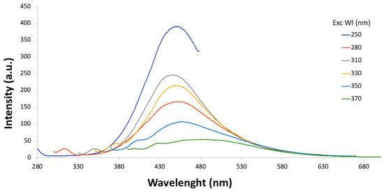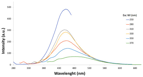 Fluorescence spectra recorded progressively increasing excitation wavelengths (from 250 to 370 nm) of T6 sample after dialysis purification.