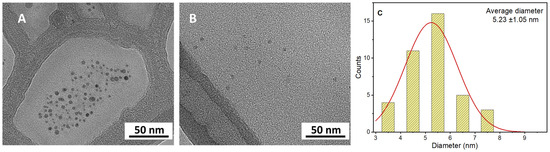 TEM images of as-prepared T6 CDs (A), and after dialysis purification (B) with corresponding particle size distribution diagram for purified sample (C).