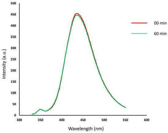 The fluorescence photostability of the CDs is an important parameter for their application in the biological field. The photostability of the T6 CD sample was therefore evaluated using the fluorometric method, as described previously [38]. The CD solution was exposed to 365 nm of UV light for 60 min, after which the fluorescence intensity was measured. The emission peak intensity remained nearly unchanged compared to the original intensity (see Figure 13). This behavior suggests that the CDs synthesized from humins exhibit good photostability, making these nanoparticles promising candidates as fluorescent probes for cell imaging and labeling. These properties may also make them suitable for microscopy, analytical applications, and other uses in the biological field. CDs are particularly suitable for biological applications not only because of their spectroscopic properties but also because toxicity studies conducted previously by various research groups have shown that they have low toxicity in vitro and in vivo. In fact, compared with metal-based quantum dots, CDs are composed of carbon, which is an intrinsically non-toxic element [20].