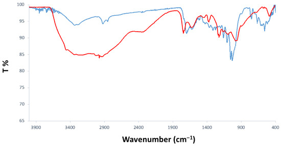 ATR-FTIR overlapped spectra of T6 CDs (red line) and their precursor humins H3 (blue line).