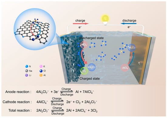 The increasing reliance on renewable energy sources, such as wind and solar power, highlights the urgent need for the development of efficient, environmentally friendly, and cost-effective energy storage solutions in contemporary energy systems [1,2]. Lithium-ion batteries are currently the most advanced technology for electrochemical energy storage, known for their high conversion efficiency, excellent cycle stability, and substantial energy density [3,4]. In anticipation of growth in the energy storage market, the production capacity of lithium-ion batteries is continuously being expanded [5]. Nevertheless, the increasing demand for energy storage presents challenges for lithium-ion batteries, including resource scarcity, high costs, and safety concerns [6,7]. Therefore, it is essential to develop robust energy storage systems to mitigate traditional energy depletion and address the intermittency issues associated with renewable energy sources [8,9,10,11,12]. Alternative energy storage technologies, including sodium-ion batteries [13,14], potassium-ion batteries [15,16], aluminum-ion batteries [17,18], and zinc-ion batteries [19,20], have received widespread attention in recent years. Among these technologies, rechargeable aluminum-ion batteries emerge as promising candidates for next-generation energy storage devices due to their high volumetric capacity (8040 mAh cm−3), abundant availability in the Earth’s crust (8.2%), and the inherent safety of aluminum anodes [21,22].