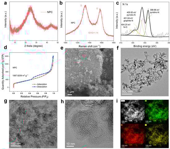 Characterizations of the NPC. (a) XRD pattern of the NPC. (b) Raman spectroscopy of the NPC. (c) N 1s XPS spectra of the NPC. (d) Nitrogen adsorption/desorption isotherms of the NPC at 77 K. (e) SEM image and (f–h) TEM images of the NPC. (i) The HAADF-STEM image and corresponding EDS mapping images for NPC.