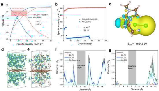 Electrochemical performances and theoretical calculations of the molten salt and ionic liquid Al-Cl2 batteries. (a) Voltage profiles of Al-Cl2 battery assembled with the electrolytes of molten salt and ionic liquid. (b) The cycling stability of the Al-Cl2 battery assembled with molten salt and ionic liquid with a charge capacity of 250 mAh g−1 at a current density of 30 A g−1. (c) Charge density difference of the Cl2 adsorption on EMIC. Snapshots of AIMD simulations for (d) ionic liquids and (e) molten salt electrolytes. Density profiles of Cl2 bonding with different species in (f) molten salt and (g) ionic liquid.