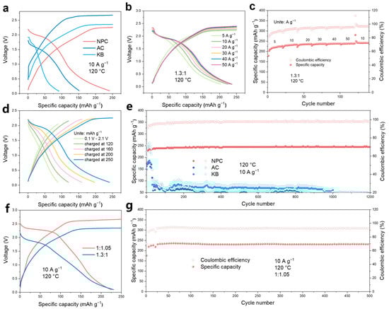 We fixed the charge capacity at 250 mAh g−1 to evaluate the rate performance of the assembled Al-Cl2 battery using NPC. As displayed in Figure 4b, the battery demonstrates outstanding rate performance and good cycling stability across current densities ranging from 5 to 50 A g−1, with only a slight decrease in the associated discharge plateau. The reversible capacities attained at current densities of 5, 10, 20, 30, 40, and 50 A g−1 were 226.5, 233.6, 236.8, 237.7, 238.8, and 239.2 mAh g−1, respectively (Figure 4c). The coulombic efficiency increased with higher current densities, reaching 90.5% at 5 A g−1 and 95.7% at 50 A g−1, aligning with previously observed trends [50]. We evaluated the cycling stability of NPC, KB, and AC (Figure 4e). At a current density of 10 A g−1 and a charge capacity of 250 mAh g−1, the Al-Cl2 battery using AC and KB as cathodes could only support a limited number of cycles, showing a rapid decrease in capacity. In contrast, the NPC enabled stable cycling for over 1200 cycles, achieving an average coulombic efficiency of 97.3% and an average reversible discharge capacity of 243.3 mAh g−1 at 120 °C.