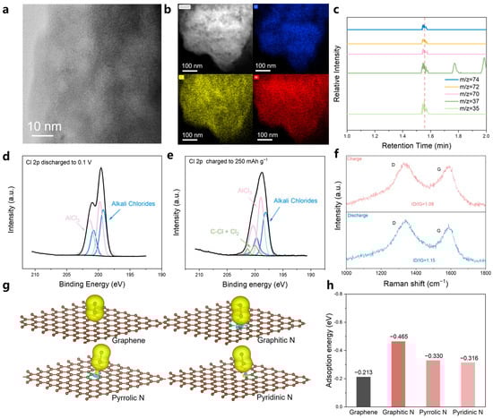 Understandings of the reaction mechanism of the molten salt Al-Cl2 battery. (a,b) TEM images for the NPC cathode after cycling. (c) EDS mapping images for NPC cathode after the battery was charged to 250 mAh g−1. (d) Cl 2p XPS spectrum of NPC electrode after the battery was discharged to 0.1 V (e) Cl 2p XPS spectrum of NPC electrode after the battery was charged to 250 mAh g−1. (f) Mass-spectrometry analysis of NPC electrodes with charged at 250 mAh g−1. (g) Charge density difference of the optimized sites for Cl2 adsorption on N-doped carbons and (h) the corresponding adsorption energies.