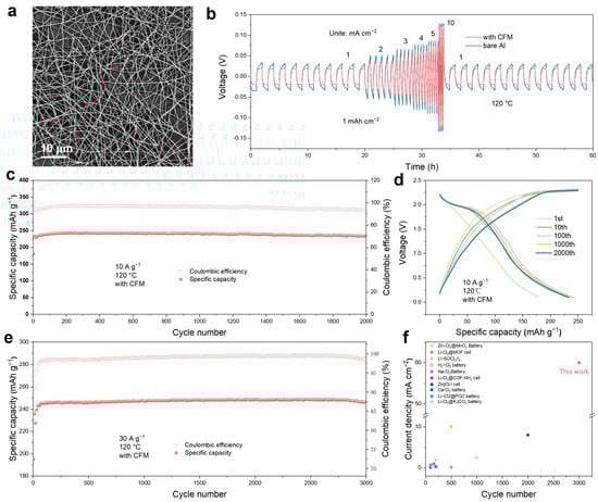 Electrochemical performances of the molten salt Al-Cl2 battery using an anode protection layer. (a) SEM images of the CFM. (b) Rate performance of Al||Al and Al@CFM||CFM@Al symmetric cells at various current densities from 1 to 10 mA cm−2 with a constant striping/plating capacity of 1 mAh cm−2. (c,d) Cycling performance and voltage profiles of the Al−Cl2 battery with the CFM at 120 °C at a current density of 10 A g−1 and a fixed charge capacity of 250 mAh g−1. (e) Cycling performance of the Al−Cl2 battery with the CFM at a current density of 30 A g−1. (f) Comparison of the cycle performance and rate performance of our Al-Cl2 battery and recently reported chlorine-based conversion reaction batteries [34,35,37,41,43,50,59,60,61].