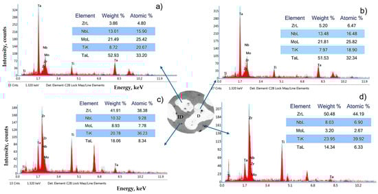 EDS microchemical composition analyses performed on the heat-treated alloy show, in dendrites (D, Figure 3), high concentration values for Ta (51.53–52.93 wt.%) and Mo (21.49–21.81 wt.%), which means that they primarily participate in the formation of dendrites (Figure 4). The other elements in the D-zone have lower concentrations than prescribed for this alloy, respectively: Ti (7.97–8.72 wt.%) and Zr (3.86–5.20 wt.%). In this area, only Nb has a chemical concentration like the designed one, namely Nb (13.01–13.48 wt.%). The chemical composition of the interdendritic zones (ID) is very different from that of the dendrites. Here, the maximum concentration is reached by Zr (41.91–50.48 wt.%), followed by Ti (20.78–23.95 wt.%), Ta (14.34–18.06 wt.%), Nb (8.03–10.32 wt.%), and Mo (3.20–8.93 wt.%).