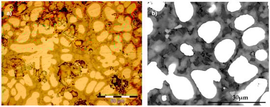 Annealing at 900 °C for 2 h, followed by water quenching, contributed to the homogenization of the alloy and the dissolution of unstable constituents. At the same time, two new secondary phases appeared, which contributed to the reinforcement of the metal matrix. Since Ti and Zr in the alloy recipe are very reactive to oxygen, even though a protective atmosphere was used in the heat treatment furnace, oxidation effects (brown and black area) appeared, especially in the interdendritic areas where the proportion of these elements is higher (Figure 6).