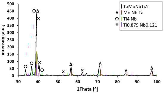 From the X-ray diffractogram of the multicomponent alloy TaMoNbTiZr presented in Figure 7, the following components are found: MoNbTa, Ti4Nb, and Ti0.879Nb0.121. The MoNbTa compound, identified at an angle 2θ = 39°, is the most prominent. Very close to it, also at an angle 2θ of approx. 39°, are the compounds Ti4Nb and Ti0.879Nb0.121. This composition is in good agreement with the designed recipe, with only minor alloy losses during processing. From the X-ray diffractogram, the main phase is Mo-Nb-Ta, with a crystal structure b.c.c. (body-centered cubic), that has the lattice parameter a = 3.24 (9) (Å) and crystallite size of 16.1 (nm). Another compound is Ti4Nb, with lattice parameters (Å) a = 3.19 (8), b = 4.87 (5), and c = 4.60 (7); crystallite size of 102 (nm); and an orthorhombic crystal structure. Also present is the phase Ti0.879Nb0.121 that has the lattice parameters (Å) a = 3.11 (9), b = 5.09 (7), and c = 4.62 (1); crystallite size of 81 (nm); and the same orthorhombic spatial group.